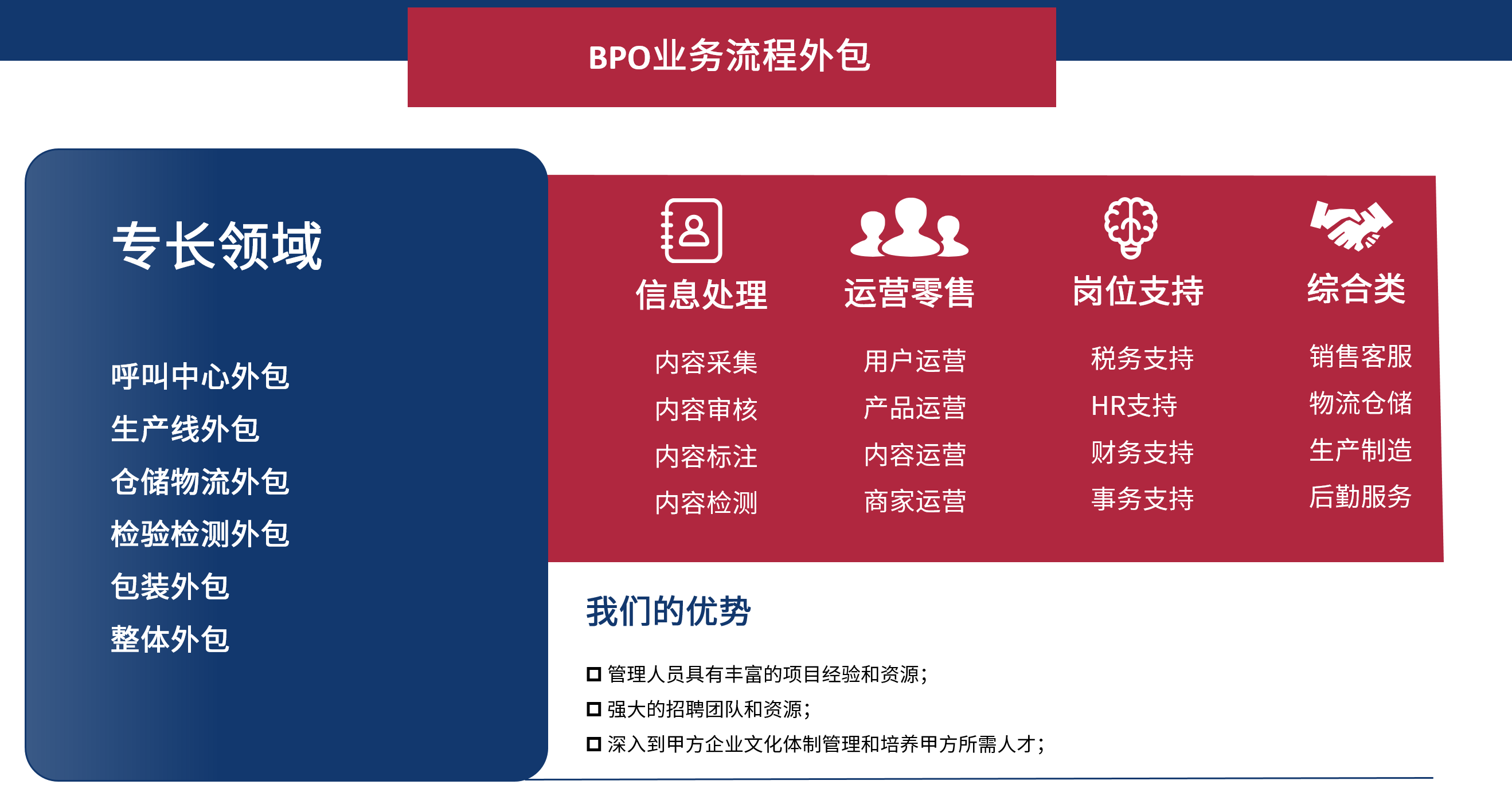 | 拓展BPO業(yè)務(wù)流程外包服務(wù),幫助企業(yè)更好地專(zhuān)注核心業(yè)務(wù)!