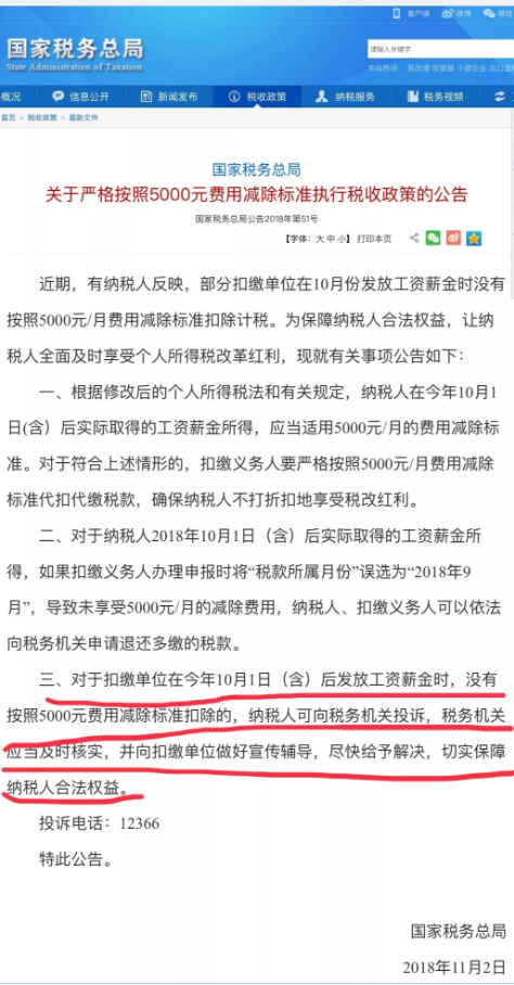 隨著(zhù)新個(gè)稅政策的實(shí)施,在剛剛過(guò)去的10月,不少上班族都表示,到手的工資變多了。但是近期,也有納稅人反映,部分扣繳單位在10月份發(fā)放工資薪金時(shí)沒(méi)有按照5000元/月費用減除標準扣除計稅。