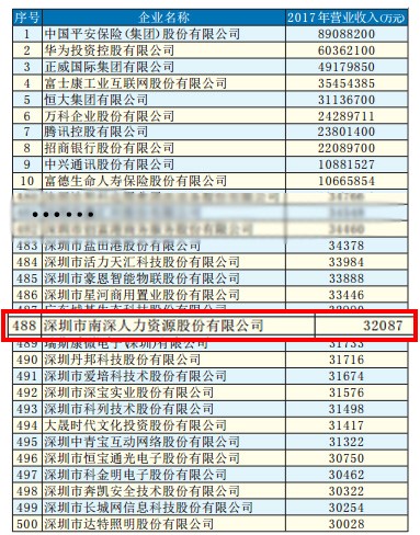 2018年12月底,由深圳市企業(yè)聯(lián)合會(huì )、深圳市企業(yè)家協(xié)會(huì )(以下簡(jiǎn)稱(chēng)深圳企聯(lián))編撰的《2018深圳500強企業(yè)發(fā)展報告》,以及報告中按照營(yíng)業(yè)收入排序的“2018深圳500強企業(yè)”名單通過(guò)《深圳商報》完成公示,并對外發(fā)布。中國平安保險(集團)股份有限公司、華為技術(shù)有限公司、正威集團居排行榜前三位,南深股份則以32087萬(wàn)元的營(yíng)收收入,排在2018深圳500強企業(yè)名單的第488位。