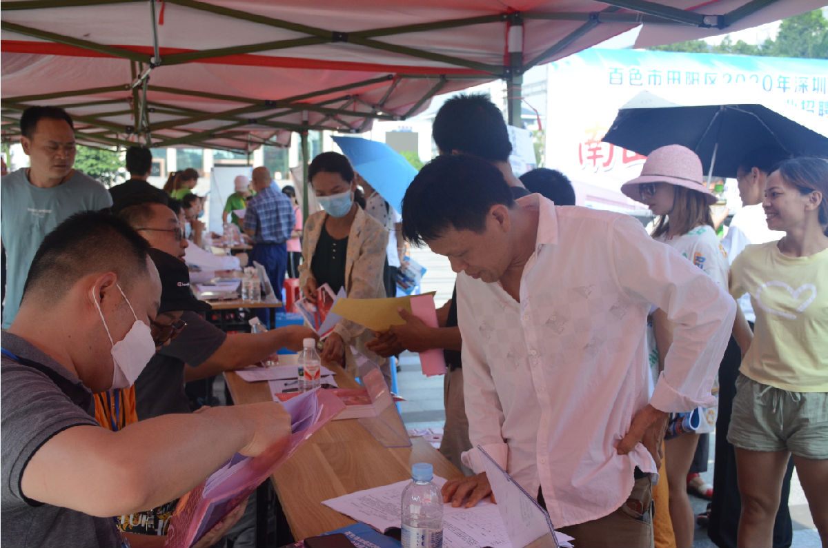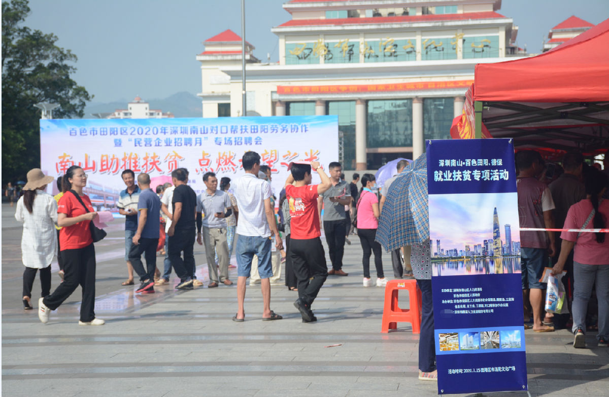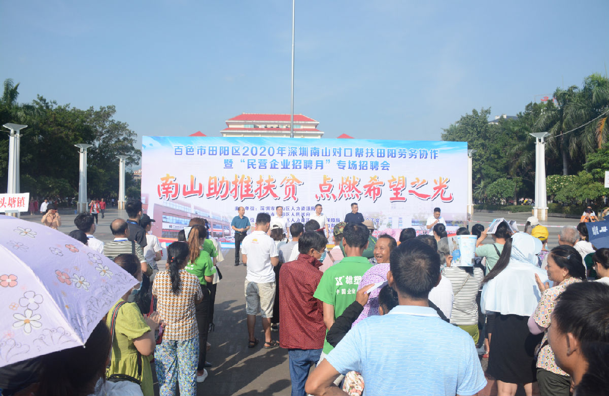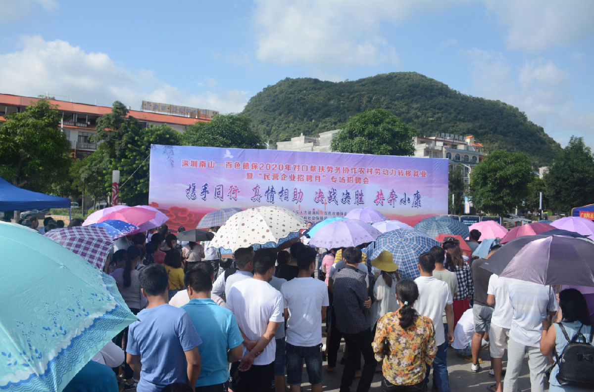 為進(jìn)一步做好“六穩”、“六?!惫ぷ?,支持民營(yíng)企業(yè)復工達產(chǎn),服務(wù)勞動(dòng)者就業(yè)創(chuàng )業(yè),深圳市南山區人力資源局以民營(yíng)企業(yè)招聘月活動(dòng)為契機,結合東西部扶貧協(xié)作工作部署,在疫情防控平穩的情況下,聯(lián)合廣西田陽(yáng)、德保兩個(gè)對口幫扶地區舉辦了專(zhuān)場(chǎng)招聘會(huì )。深圳市南深人力資源股份有限公司(下稱(chēng):南深股份)作為此次活動(dòng)的承辦單位,攜手深圳市15家用工企業(yè)相關(guān)招聘負責人,于2020年7月15日和16日,在廣西百色田陽(yáng)區布洛陀文化廣場(chǎng)和德??h騰飛廣場(chǎng)分別開(kāi)展了就業(yè)扶貧專(zhuān)場(chǎng)招聘活動(dòng)。