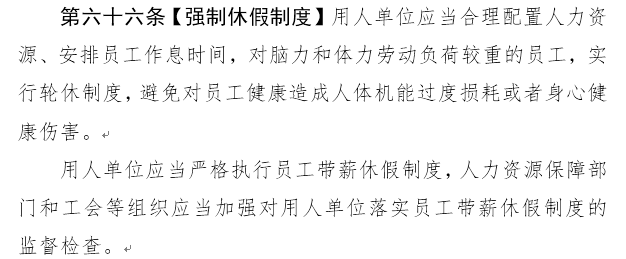 出于保護員工職業(yè)健康的目的,本次健康條例意見(jiàn)稿第六十六條【強制休假制度】規定: