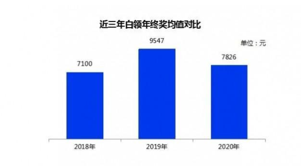 調研顯示,2020年全國白領(lǐng)年終獎平均值為7826元,較2019年的9547元縮水18%。