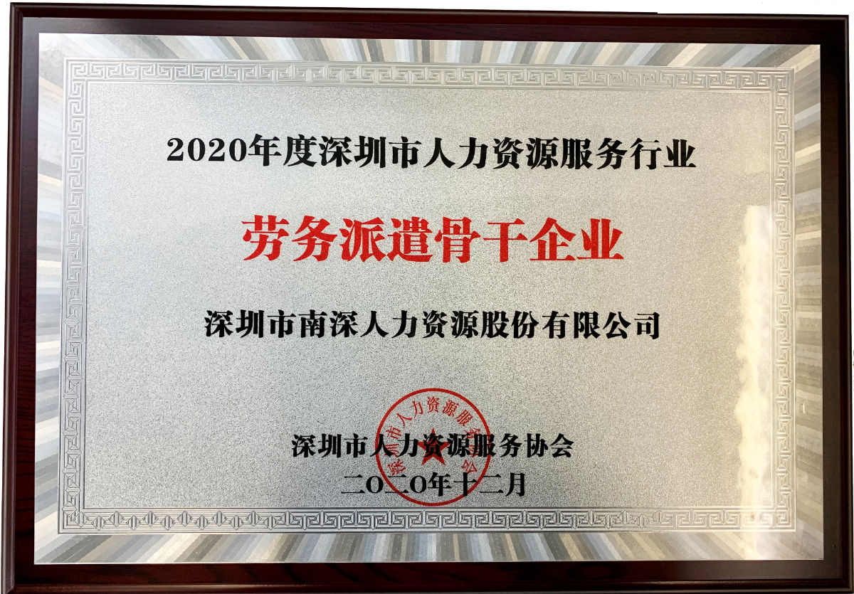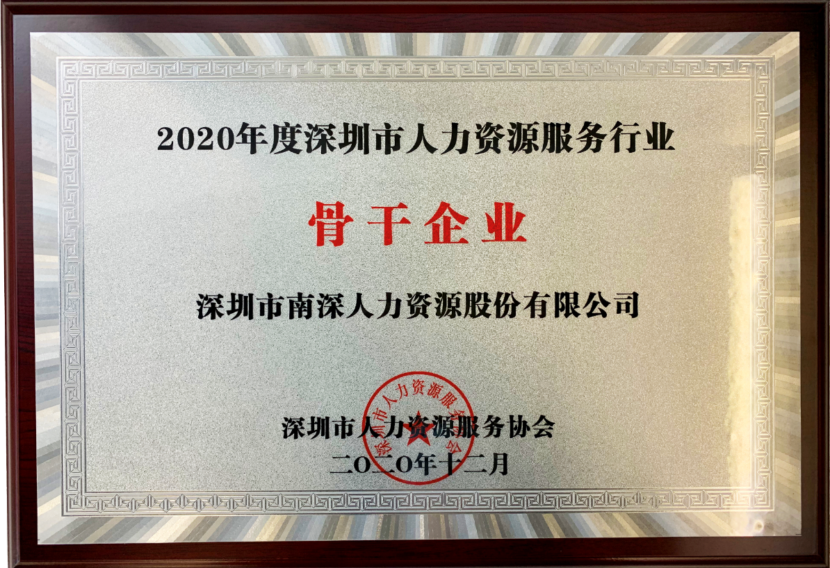 此前,為培育和宣傳深圳市人力資源服務(wù)行業(yè)骨干企業(yè),切實(shí)發(fā)揮骨干企業(yè)的行業(yè)示范和引領(lǐng)作用,做強品牌,做大產(chǎn)業(yè),深圳市人力資源服務(wù)協(xié)會(huì )組織開(kāi)展了2020年度深圳市人力資源服務(wù)行業(yè)骨干企業(yè)評選活動(dòng)。南深股份憑借多年行業(yè)深耕和再勞務(wù)派遣服務(wù)方面的突出表現,獲得行業(yè)一致認可。