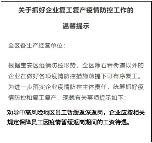 中高風(fēng)險地區員工被勸導暫緩返深返崗