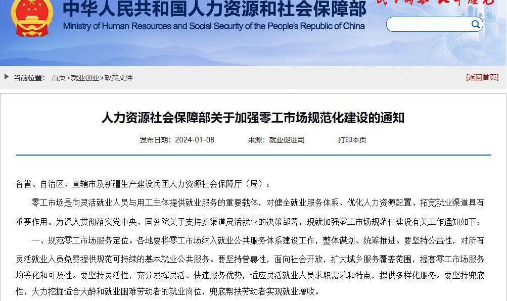 人力資源社會(huì )保障部印發(fā)通知推動(dòng)加強零工市場(chǎng)規范化建設